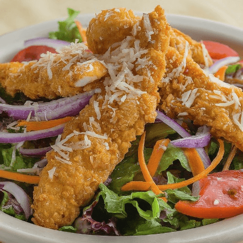 Golden, crispy chicken tenders served atop fresh, crisp greens with ripe tomatoes, and onions, finished with our creamy house-made dressing. A signature salad that’s crunchy, flavorful, and satisfying in every bite.