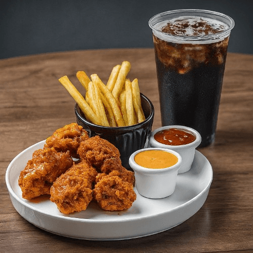 Indulge in our succulent boneless wings, crafted from premium, tender chicken breast, and perfectly seasoned for maximum flavor. Each piece is fried to a crispy exterior with a juicy, mouthwatering center. Choose from our variety of delectable sauces and dry rubs, ranging from sweet and tangy to fiery and bold. Served with crispy fries and a refreshing drink.