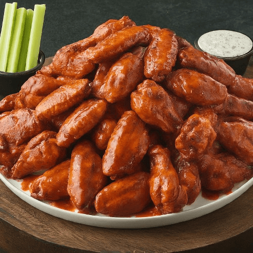 Served with celery & 1 dressing per 10 pieces wings. Crispy, golden-fried chicken wings tossed in one of our many signature sauces