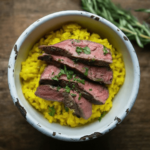 Tender steak slices served over a bed of fluffy rice.
