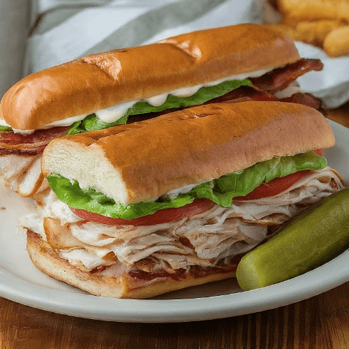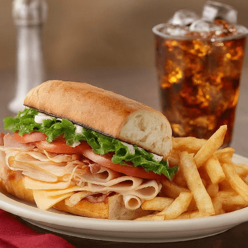 Flavorful turkey and ham stacked with crisp lettuce, ripe tomatoes, and creamy house-made mayo on a toasted hoagie roll, served with crispy fries and a refreshing drink. A signature combo that’s fresh, hearty, and perfectly satisfying.