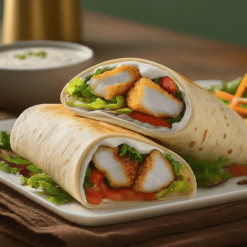 Crispy golden chicken tenders paired with fresh lettuce, ripe tomatoes, and creamy house-made sauce, all wrapped in a soft tortilla. A signature favorite that’s crunchy, flavorful, and perfect on the go.