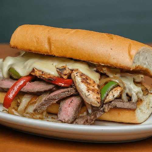 A tender duo of seared steak and grilled chicken, stacked with sautéed onions and melty cheese. Bell peppers and our signature seasoning add bold flavor, all tucked into a soft toasted roll for the ultimate Philly fusion.