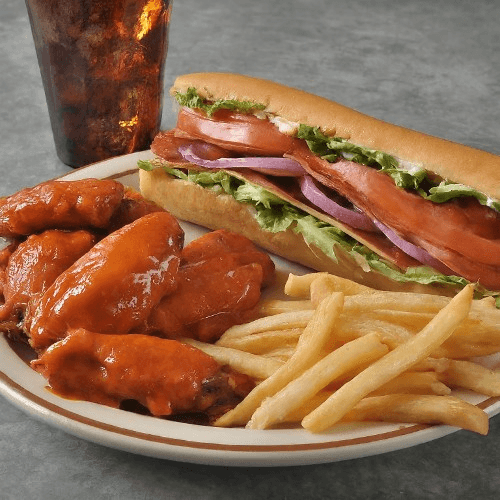 Enjoy your favorite grilled sub, packed with tender meat, crisp lettuce, and ripe tomatoes on a toasted house-made roll, paired with five crispy, flavorful wings, golden fries, and a refreshing drink. A signature combo that delivers bold, satisfying flavor in every bite.