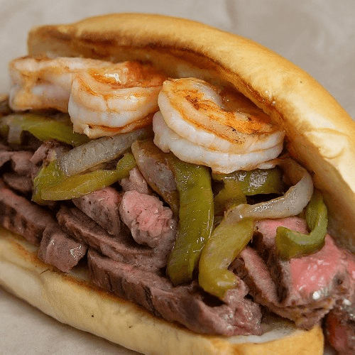 Juicy sautéed shrimp and tender seared steak come together with caramelized onions and melty cheese. A pop of bell peppers and our signature seasoning elevate every bite, all served on a house-made toasted roll for a bold surf-and-turf twist.