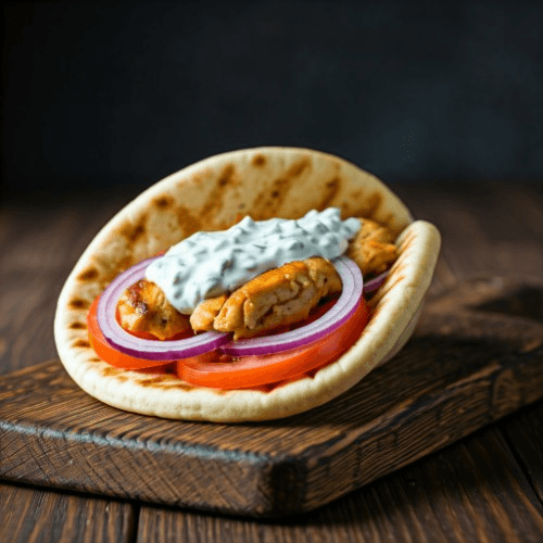 Comes with sliced tomatoes, onions, and homemade white sauce *This item contains Allergens