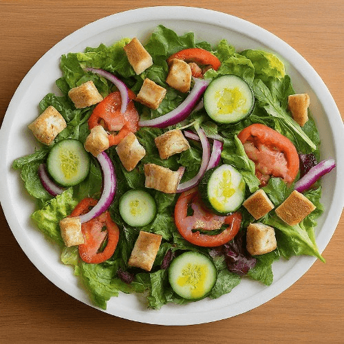 A crispy mix of fresh lettuce, ripe tomatoes, cucumbers, and colorful veggies, tossed with your choice of house-made dressing. A signature salad that’s fresh, vibrant, and bursting with flavor in every bite.